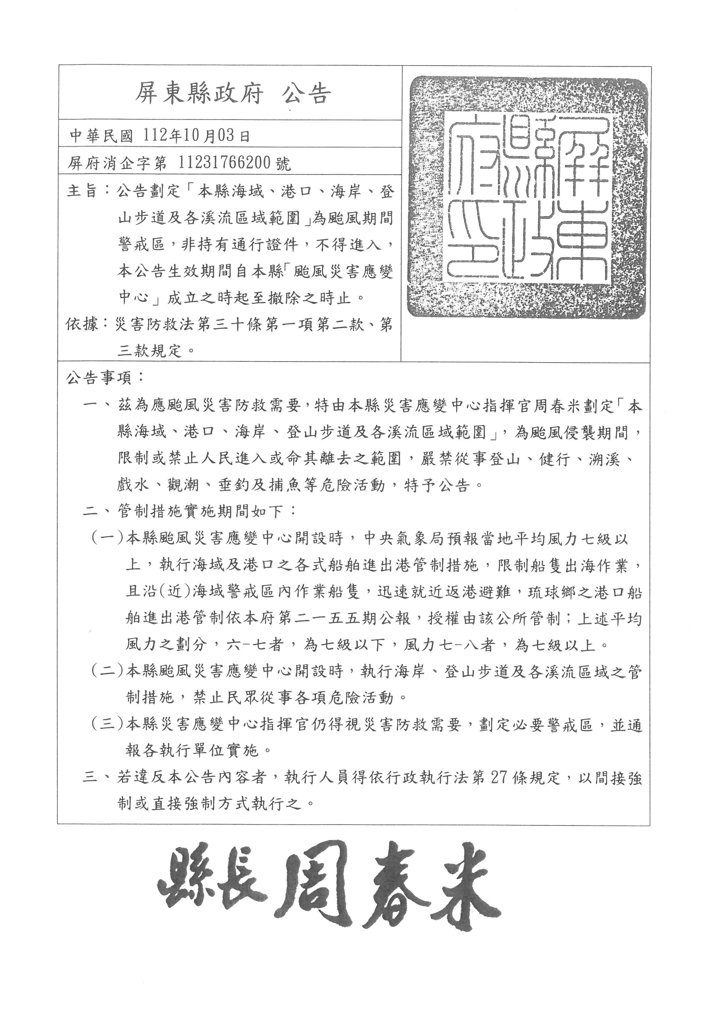 依據本府112年10月3日屏府消企字第11231766200號公告辦理。
