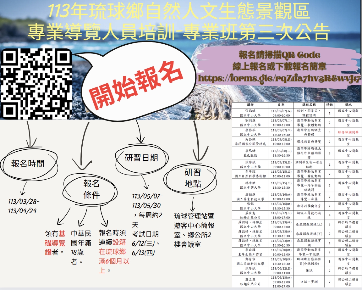 113年琉球鄉自然人文生態景觀區 專業導覽人員培訓課程 專業班開放報名!